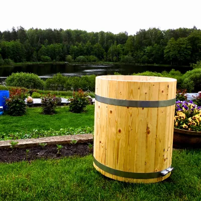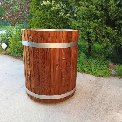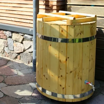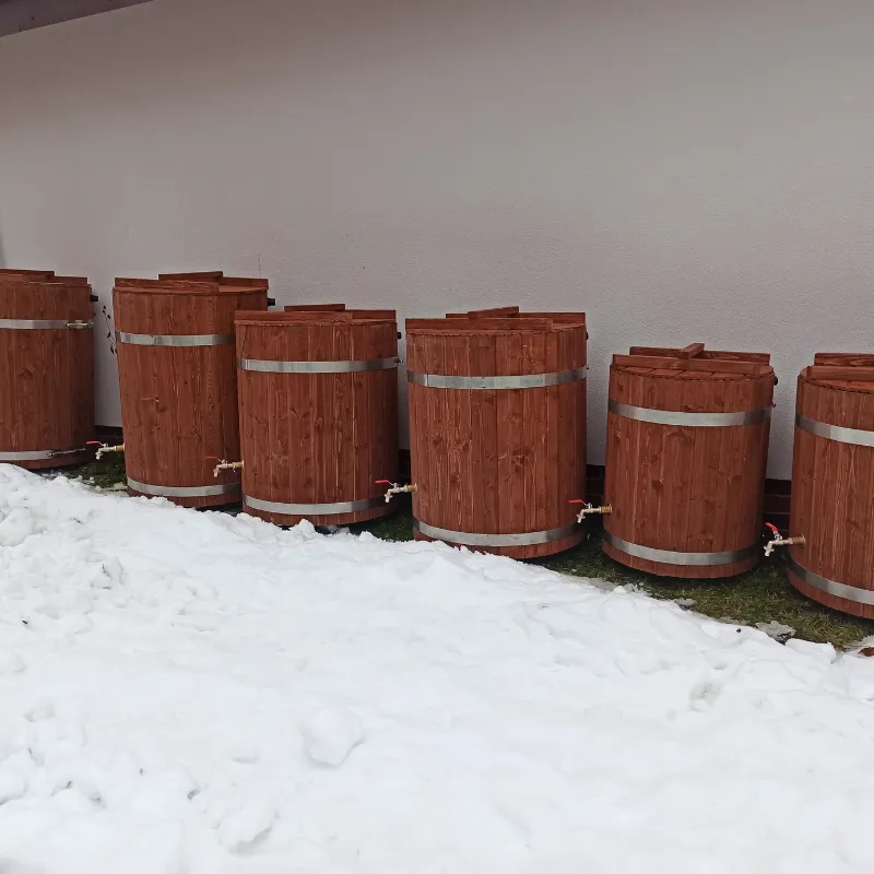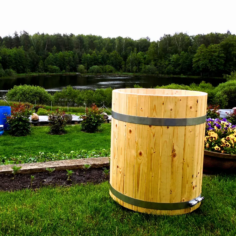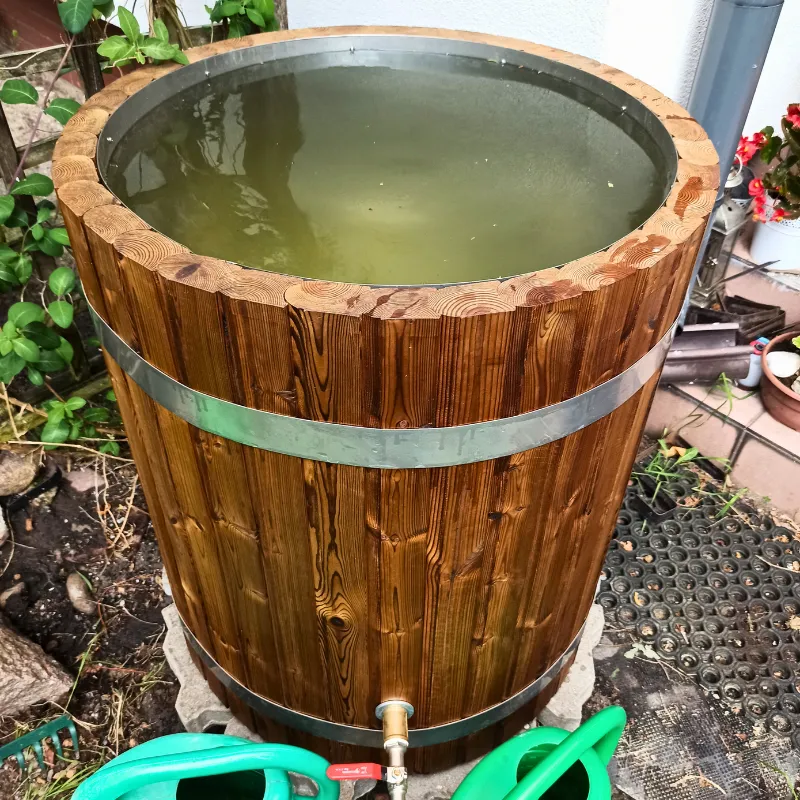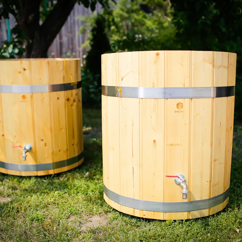 zbieraj wodę opadową w pięknych, drewnianych zbiornikach na wodę deszczową. Beczki wyposażone w kranik i pokrywę. Ekologia, piękno i wygoda w jednym produkcie.